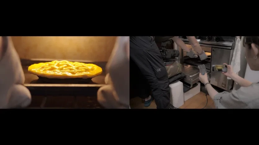 야나기시타: 그리고, 하나전의 컷으로 모델씨의 위치를 봐 주시면 알 수 있습니다만, 카메라의 삼각대를 세울 수 있는 공간이 없기 때문에, 오븐의 뚜껑 위에 촬영용의 비즈백을 사용해 카메라를 설치해 촬영하고 있습니다. 고정이 불충분한 것과, 내부에의 찍힘도 있기 때문에, 여기에서도 DFF를 사용해 포커스 워크를 하고 있습니다.