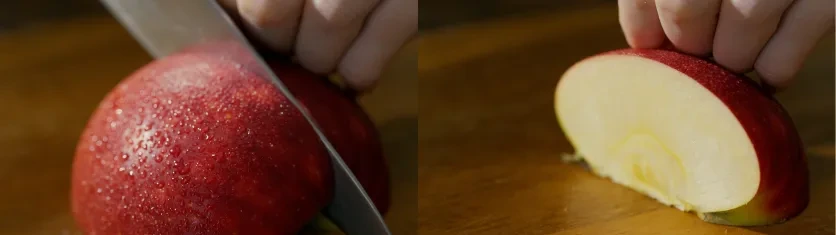 편집부 : 그런 의도를 담아 촬영하고 있었군요. 심오해서 공부가 됩니다. 이어서 사과를 자르는 장면인데 이것도 90mm F2.8 MACRO를 사용한 촬영인가요?