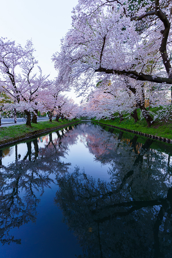 꽃 뗏목이나 거꾸로 된 벚꽃을 촬영할 때는 망원 렌즈를 사용해 봅시다. 망원 렌즈를 사용하여 수면의 벚꽃과 지상의 벚꽃을 같은 화각으로 파악합니다. 이때 압축효과를 통해 앞에서부터 끝까지 벚꽃을 일체적으로 보여줌으로써 더욱 아름답고 인상적인 사진으로 완성됩니다.