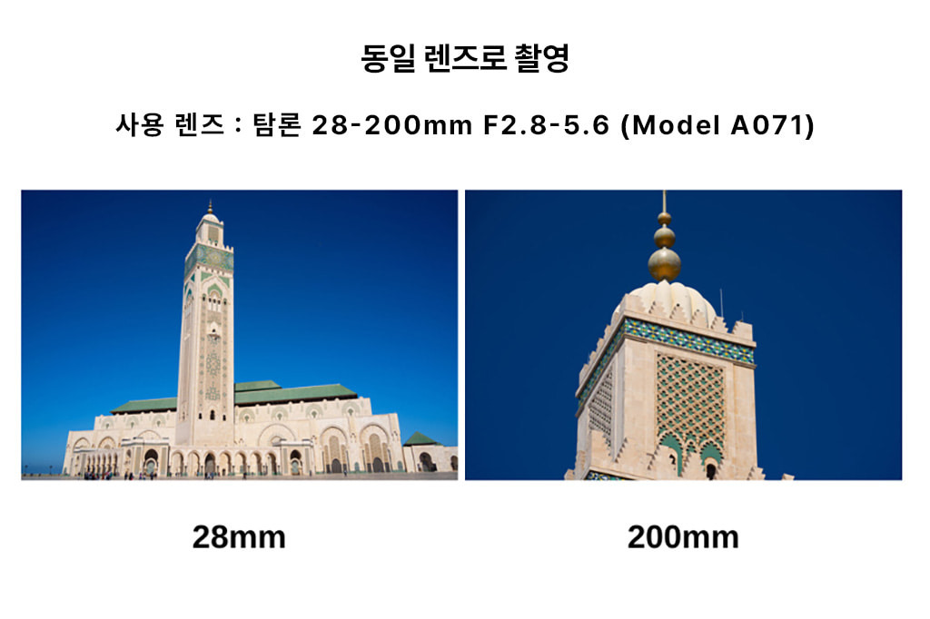 예를 들어 다음 작품은 탐론 28-200mm F2.8-5.6(Model A071)으로 광각, 망원으로 촬영된 사진입니다. 이처럼 광각에서는 건물 전체를 비출 수 있고 망원에서는 일부분에 초점을 맞춘 화각이 됩니다.