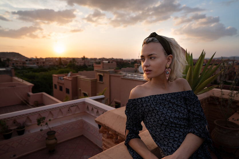 또, 중심이 되는 인물 등의 피사체에 대해서 배경을 크게 비추는 구도도 매력적인 사진을 촬영할 수 있습니다. 예를 들면 이쪽의 예시 사진에서는 인물에 시선이 집중하면서, 선명하게 디테일까지 비친 배경이 중심이 되는 모델의 아름다움을 돋보이게 하고 있습니다.