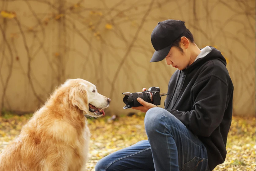 반려동물과의 산책 중에는 생동감 있는 사진을 촬영할 기회입니다. 카메라를 낮게 잡고 반려동물의 눈높이에 맞춥니다. 로우 앵글 촬영도 추천합니다.