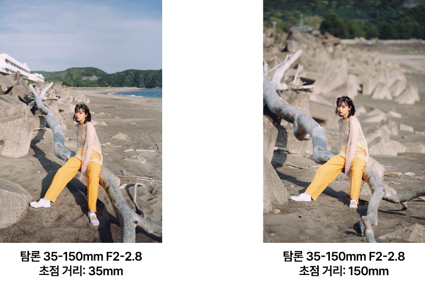 예를 들어 같은 위치에 서 있는 인물을 아래 35mm(광각측/왼쪽)와 150mm(망원측/오른쪽)로 촬영한 2장의 예시를 살펴보겠습니다.