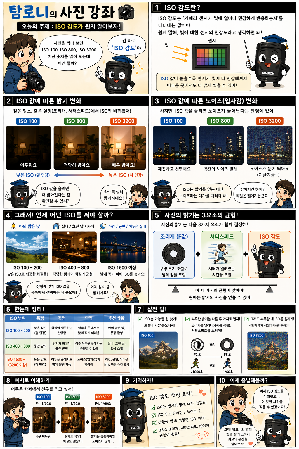 필름 시절부터 사용해보신분들은 ASA로도 익숙한 ISO! 숫자가 낮고 높음이 의미하는 것들과 원하는 결과물을 얻기위해 뭘 해야하는지 한번 알아보아요. 게시판 담당자인 저는 사진을 처음 시작할때 높은게 마냥 좋은건줄 알고, 어릴적 전재산을 털어 떠난 장기 배낭여행에서 ISO를 800~1600으로 놓고 사진을 8천장정도 찍어왔는데.. 귀국해서 확인한 사진에 잔뜩 껴있는 자글자글한 노이즈를 보고 엄청난 충격을 받았답니다... (그 시절 카메라는 요즘보다 고감도 노이즈가 훨씬 많아서.. 충격이 더 컸었네요.. 그때 당시 저는 니콘 D70이라는 녀석을 사용했었답니다....)