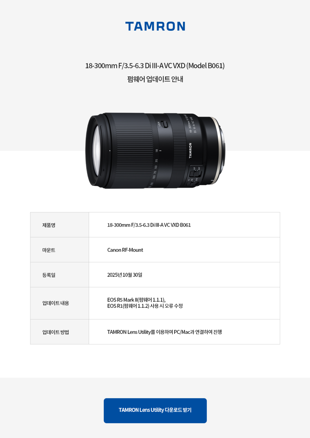 TAMRON 18-300mm F/3.5-6.3 Di III-A VC VXD for RF-Mount 펌웨어 업데이트 2025. 11. 11. 15:06 공유하기 게시글 관리 TAMRON Korea(탐론 코리아)